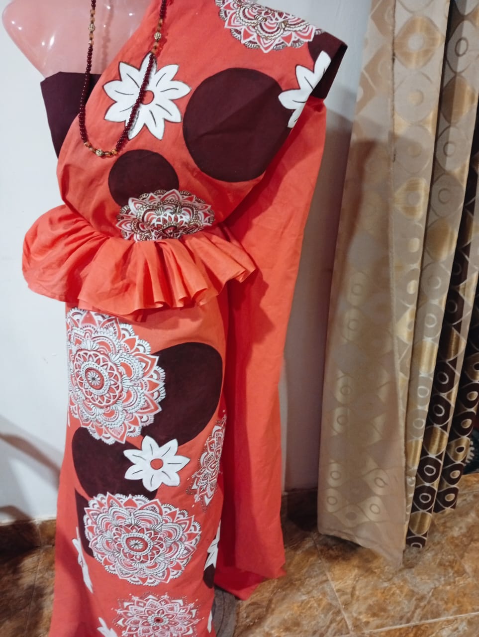 This elegant hand-painted saree features a vibrant mix of red-orange, deep brown, and white tones, showcasing traditional floral mandala patterns. Paired with a stylish "Yara 1,4/1" jacket,... more details
