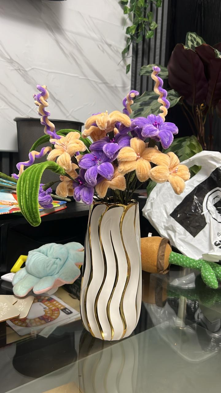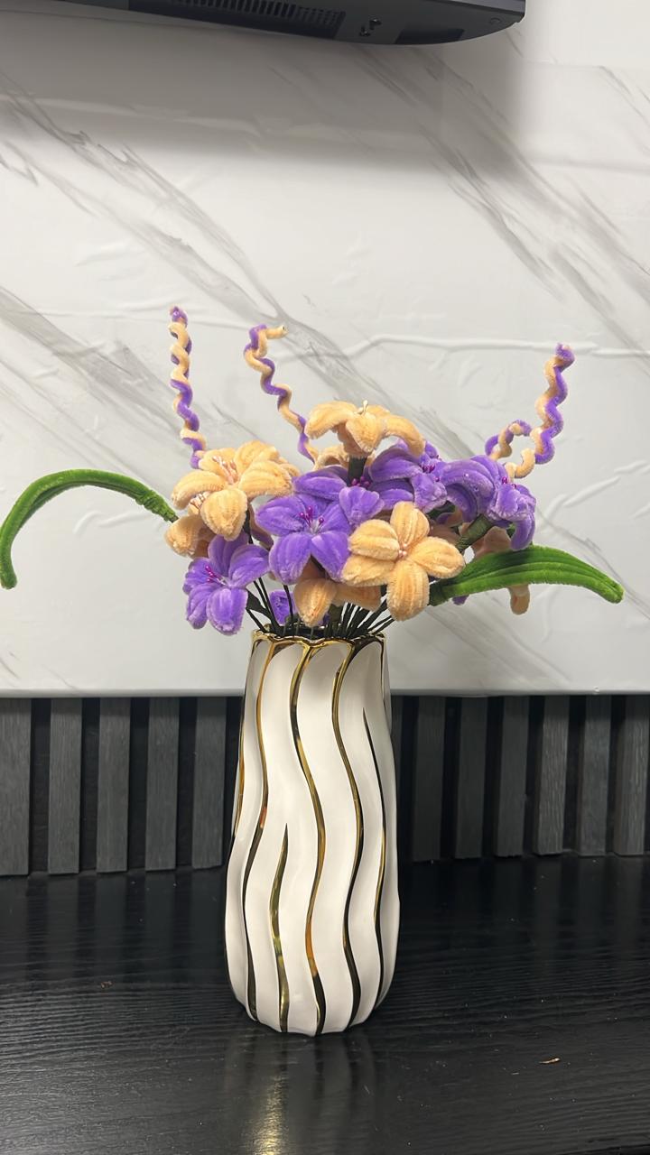 K.U.L PRODUCTSHandmade flower vase crafted from colorful pipe cleanersContains 20 flowers arranged beautifully in a vasePrice: Rs. 2000/=Attractive design with vibrant colors (purple and cream ... more details