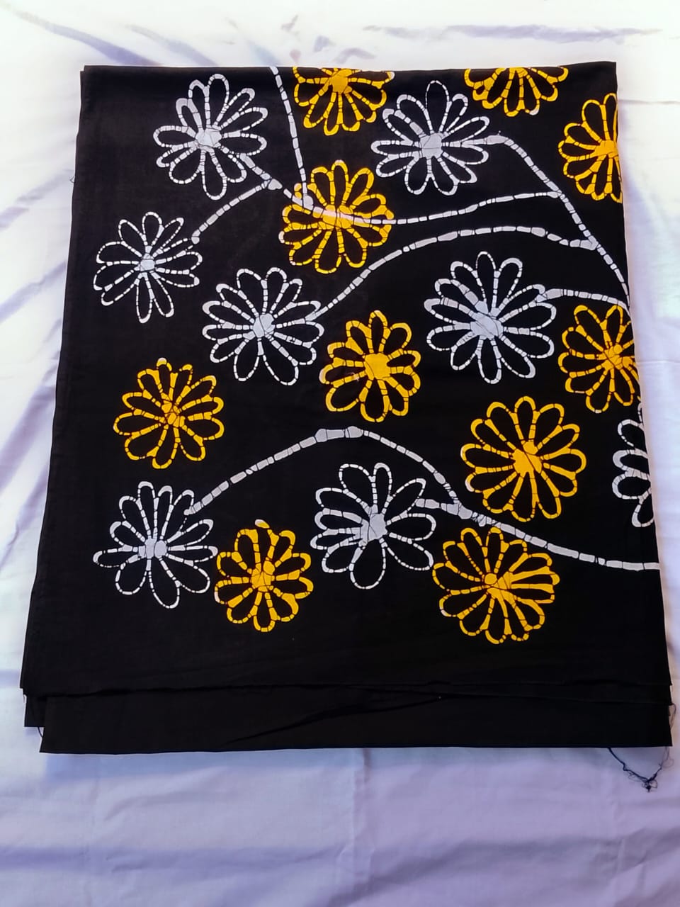 DENO FASHIONHandmade batik sareePrice: Rs. 7,500/=Color mix: Yellow, White & BlackLength: 7 yardsComes with matching jacket pieceBeautiful floral batik designComfortable fabric suitable for any o... more details