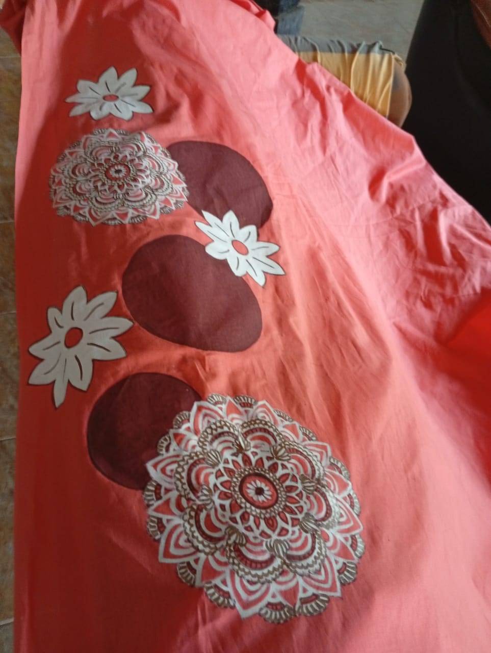 This elegant hand-painted saree features a vibrant mix of red-orange, deep brown, and white tones, showcasing traditional floral mandala patterns. Paired with a stylish "Yara 1,4/1" jacket,... more details
