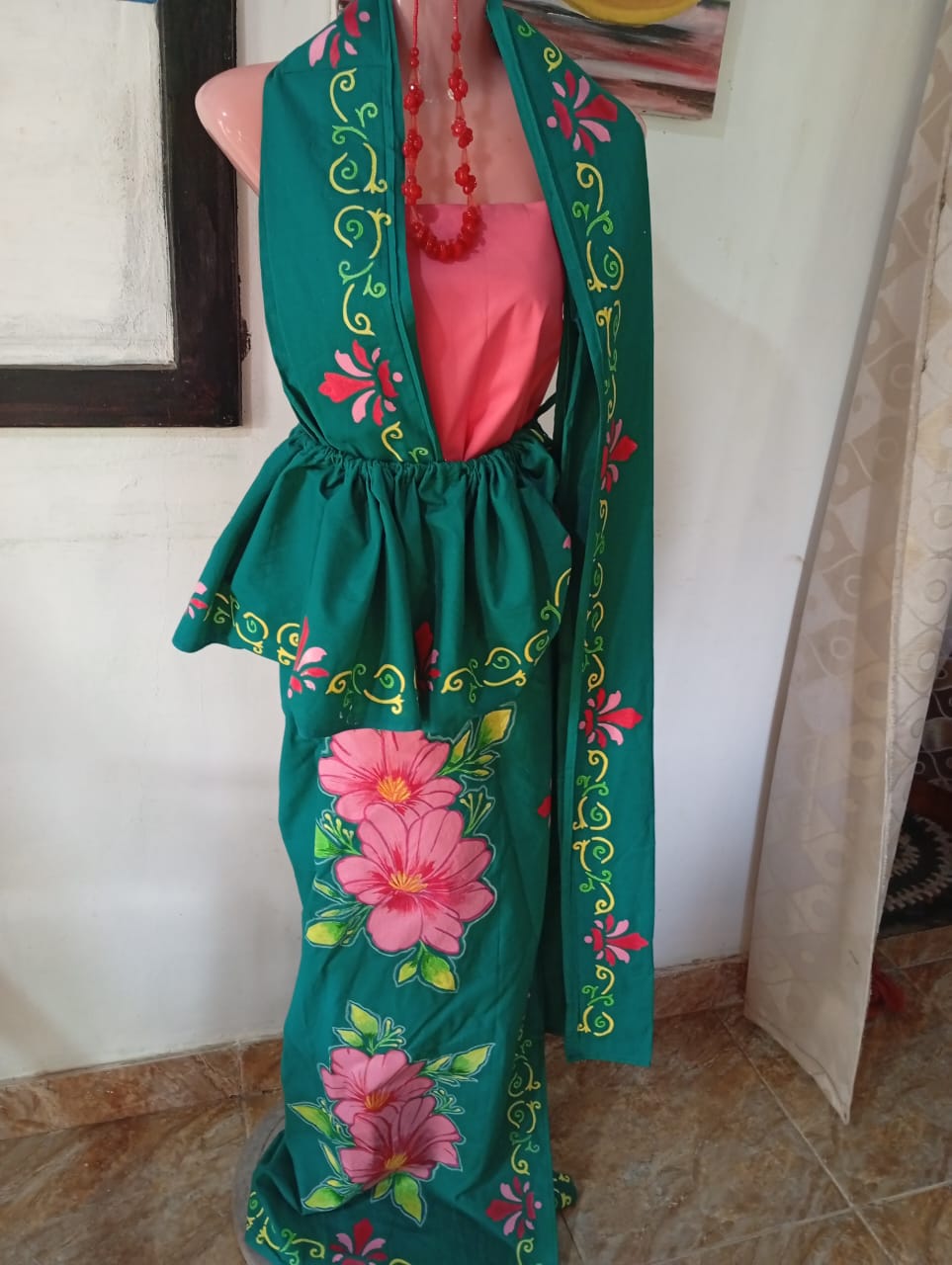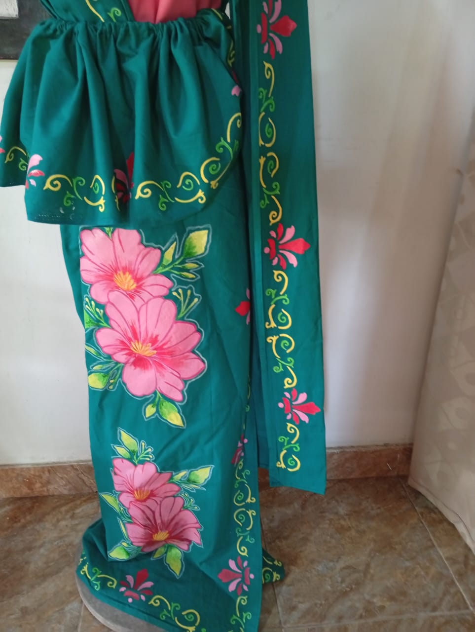 This beautiful green saree features exquisite hand-painted pink floral patterns, enhanced with delicate yellow and green accents. The matching blouse and border design add a perfect touch of sophisti... more details